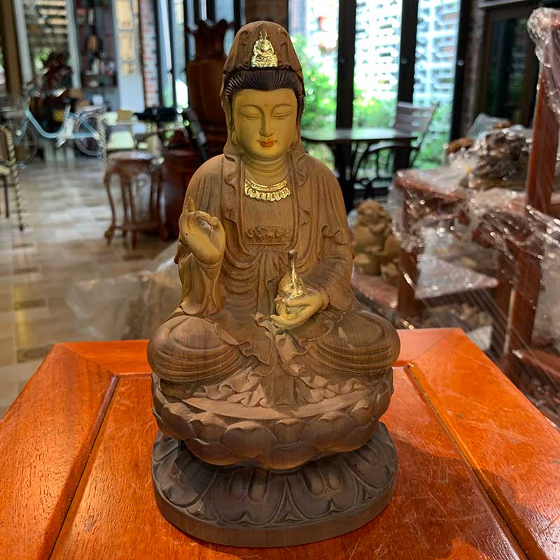Tượng Phật Bà Quan Âm bằng gỗ nổi bật với hình ảnh Phật Bà tay phải cầm nhành liễu, tay trái cầm bình nước cam lộ để cứu độ chúng sinh khỏi biển khổ trần gian. Đây là hình ảnh quen thuộc đối với mỗi người Phật tử, tượng trưng cho sự an lạc, bình an và lòng từ bi vô bờ bến.