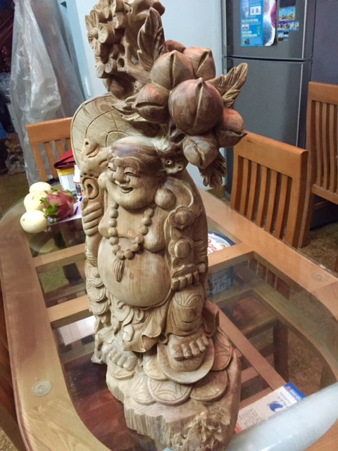 Tượng Di Lặc vác cành đào gỗ Ngọc Am Hà Giang, kích thước cao 85, ngang 29, sâu 23 cm, chất gỗ già đanh, thơm phức, tuyết bắt đầu ra nhiều, được chế tác từ các nghệ nhân làng nghề Đông Giao, nét đục sắc nét mang tính nghệ thuật, thể…